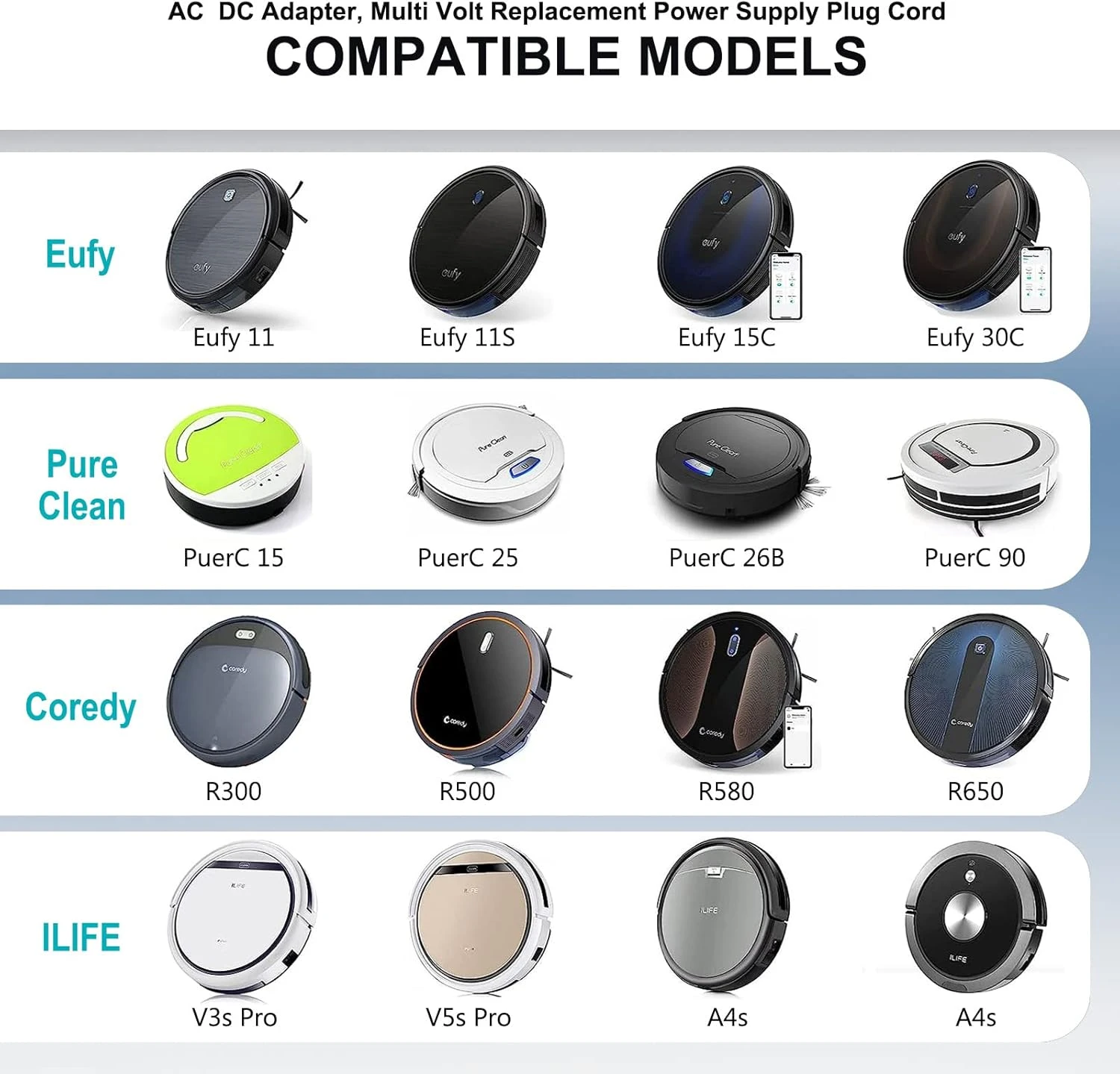 - 1. 【Compatibility】Replacement models for Eufy RoboVac 11, Eufy Boost IQ RoboVac 11S, Eufy RoboVac 11+ 2nd Gen, Eufy BoostIQ RoboVac 12, Eufy BoostIQ RoboVac 15C, Eufy BoostIQ RoboVac 30C, Eufy BoostIQ RoboVac 30, Eufy BoostIQ RoboVac 35C, Pure Clean PUCRC 15, PUCRC 25, PUCRC 26B, PUCRC 90, Coredy Robotic R300 R500 R500+ R550 R580 R650 R750 L900 G800, ILIFE V3s Pro/ A4s Pro/ V5s Pro/V8s/V80 Max/V9e/A9/A10/A80 Max Robot Vacuum Cleaner.