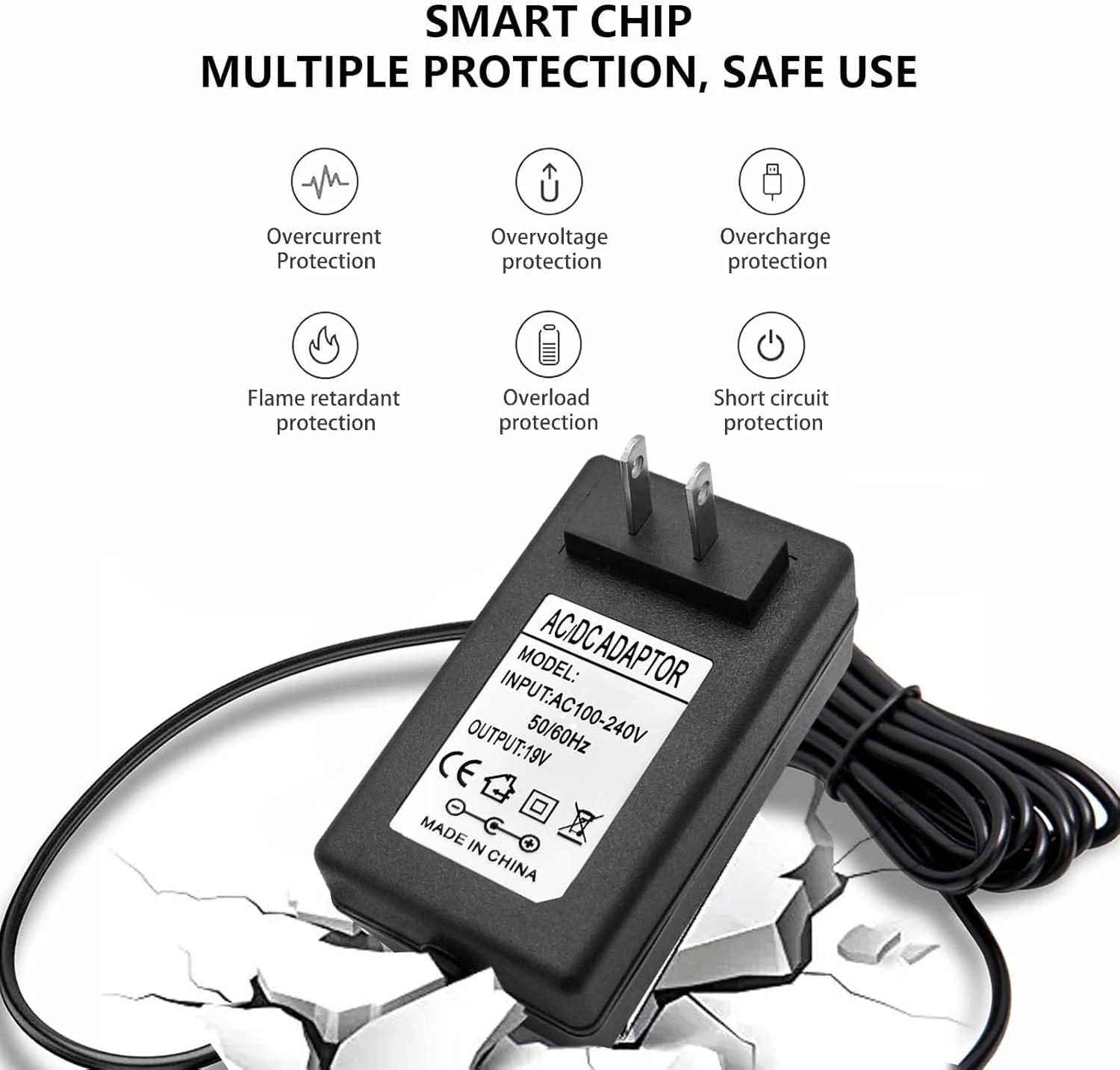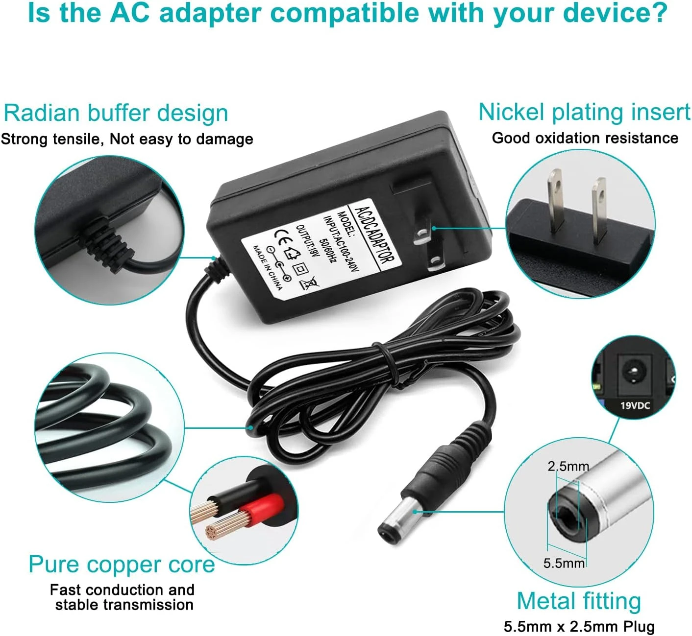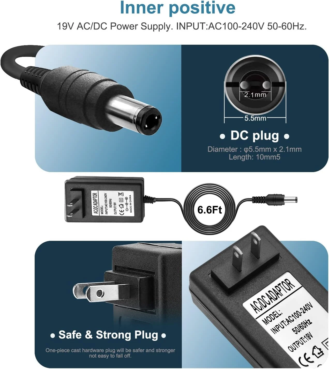 - 4. 【Safely Device】19V AC adapter power supply charger With Multi-Protect safety system, Full protection while charging your device,Safety protection functions supported:Over temperature protection,Short circuit protection,Over voltage protection,Over current protection,Over load protection. ( !!! DC Jack: 5.5 x 2.5/2.1mm, Polarity: Inner positive(+), Outer negative(-)