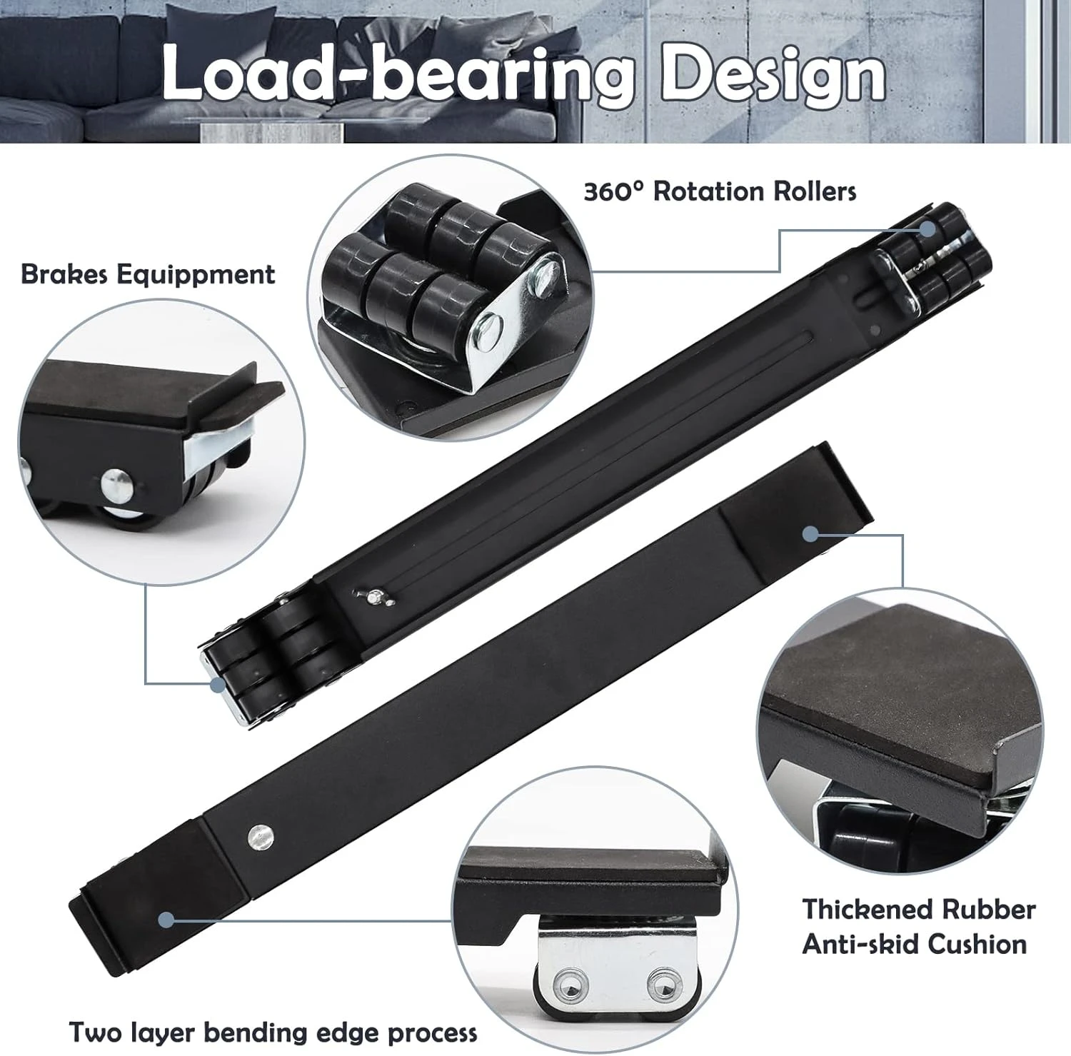 - FURNITURE CONTACT BASE: Rubber cushions are placed at both ends of the roller bracket. They are thick and strong and will protect the feet of goods and furniture from damage.