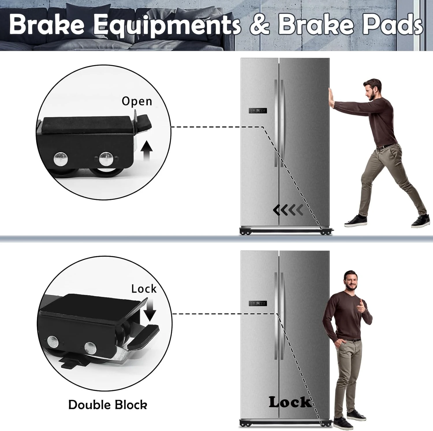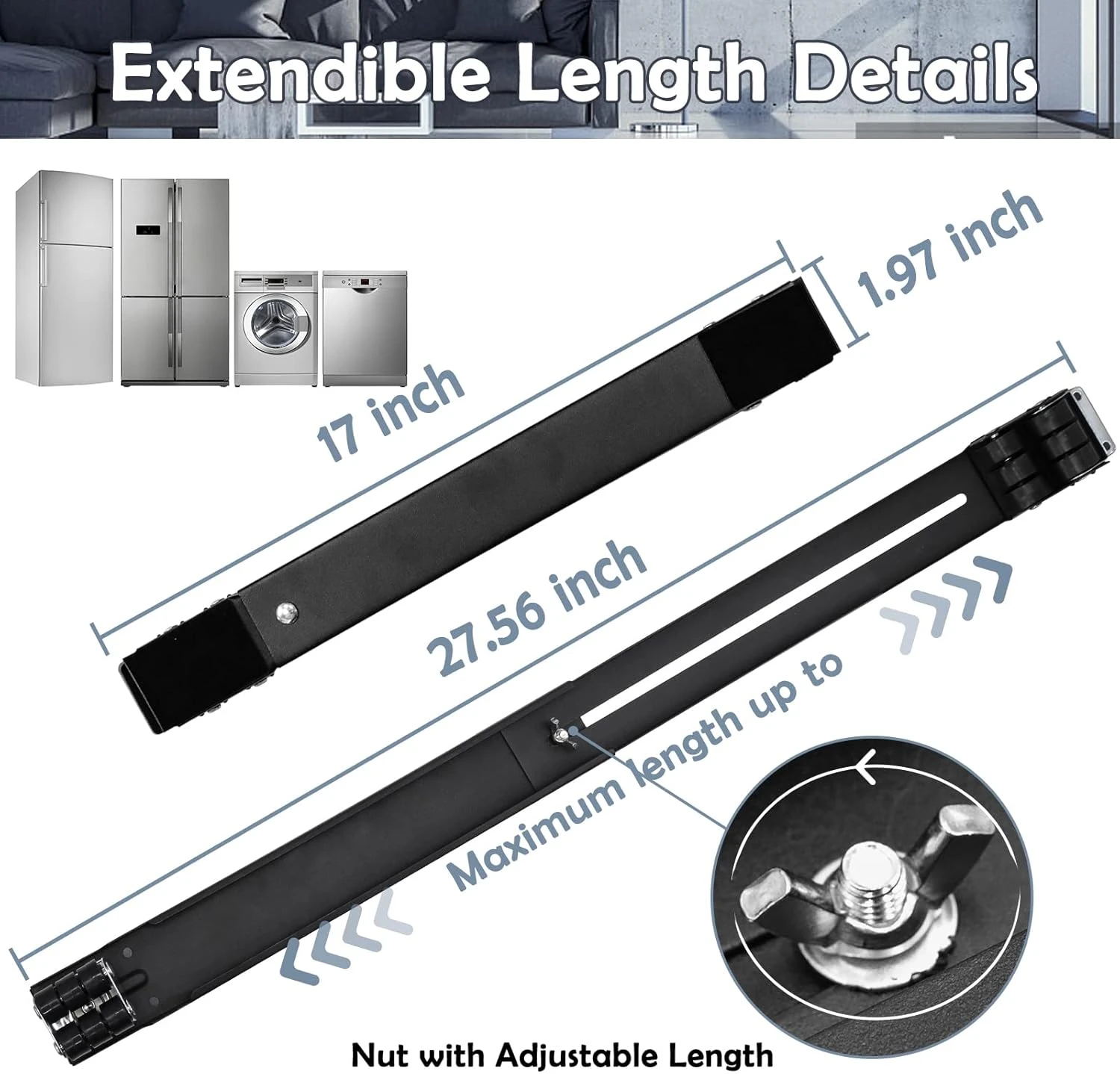 - INSTRUCTION MANUAL: 1) Extend the appliance roller to your suitable length, then tighten the screws on the back. 2) Place your appliance rollers under the furniture. Repeat the steps. 3) Moved your furniture to the appropriate place, and finally press the brake switch (most important).