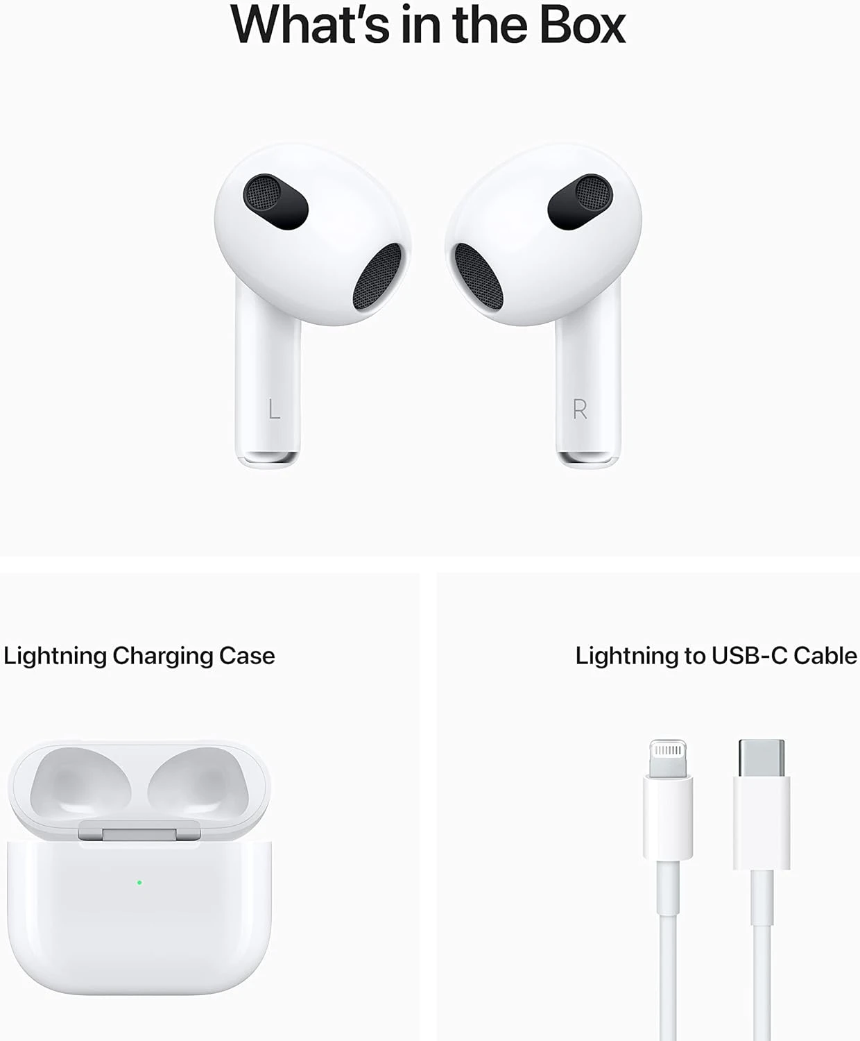 | Additional Information | Spatial Audio works with movies, TV, and video in supported apps. iPhone with TrueDepth camera required to create personalized profile. Battery life varies by use and configuration. AirPods (3rd generation) are sweat and water resistant for non-water sports and exercise, and they are IPX4 rated. Sweat and water resistance are not permanent conditions. Siri may not be available in all languages or in all areas, and features may vary by area. Internet access required. Cellular data charges may apply. Requires an iCloud account and a compatible Apple device running the latest operating system software. Works with iPhone 8 or later and iPod touch (7th generation) with the latest version of iOS; and 12.9-inch iPad Pro (2nd generation or later), 11-inch iPad Pro, 10.5-inch iPad Pro, iPad (5th generation or later), iPad Air (3rd generation or later), and iPad mini (5th generation or later) with the latest version of iPadOS. |