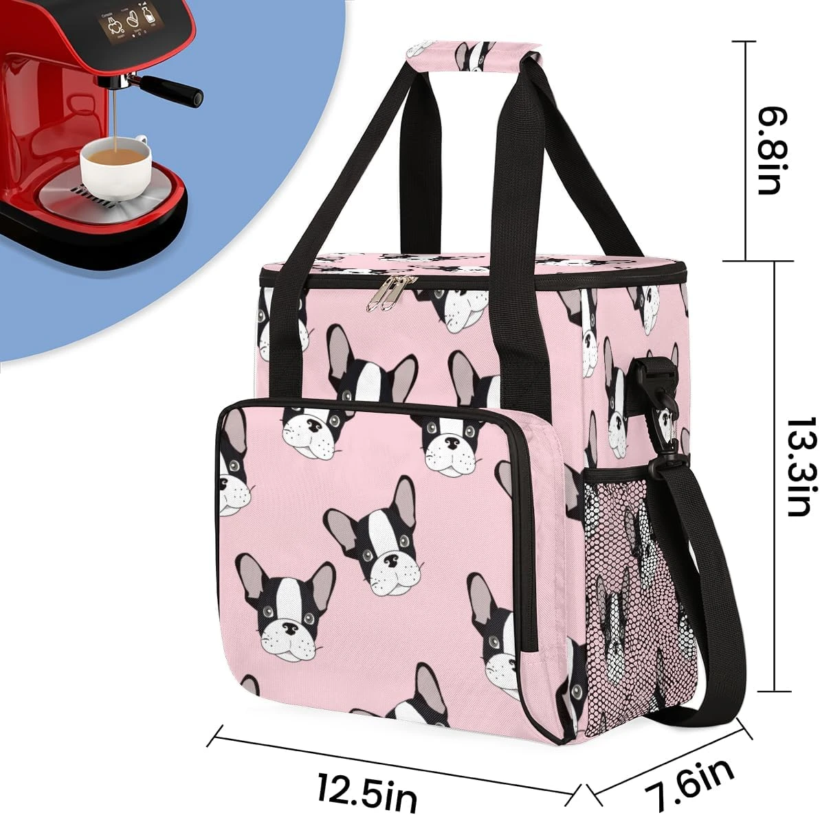 - MULTIPLE POCKETS : The coffee maker carry bag size is 12.5 x 7.6 x 13.3 inches. And the soft handle size is 6.8 inches. The main compartment can easily accommodate your coffee machine. Front compartment with 4 small PVC pockets and 1 internal zippered pocket, which can be used to store coffee beans, sugar bags, napkins, coffee spoons, cleaning brushes, etc. The external 2 side mesh bags can hold your travel cups, umbrellas or other personal small items.