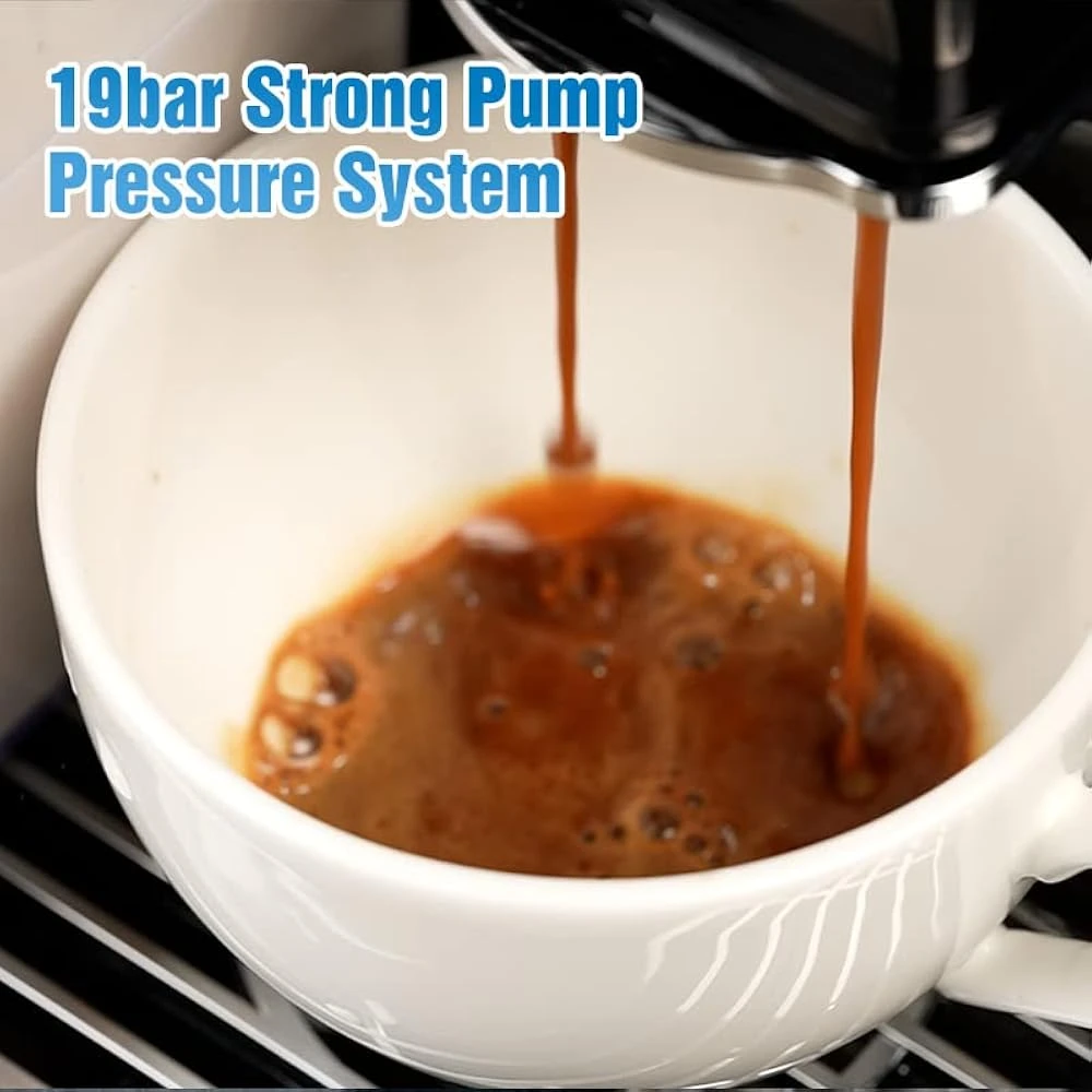 - 19 BAR GOLDEN EXTRACTION PRESSURE: 19 Bar professional pump fully extracts the coffee oil in short time, together with the pre-brewing function, the coffee is rich in oil and has a good taste. With a single touch, the integrated precision conical burr grinder with dose control delivers the right amount of coffee on demand, for maximum flavor.