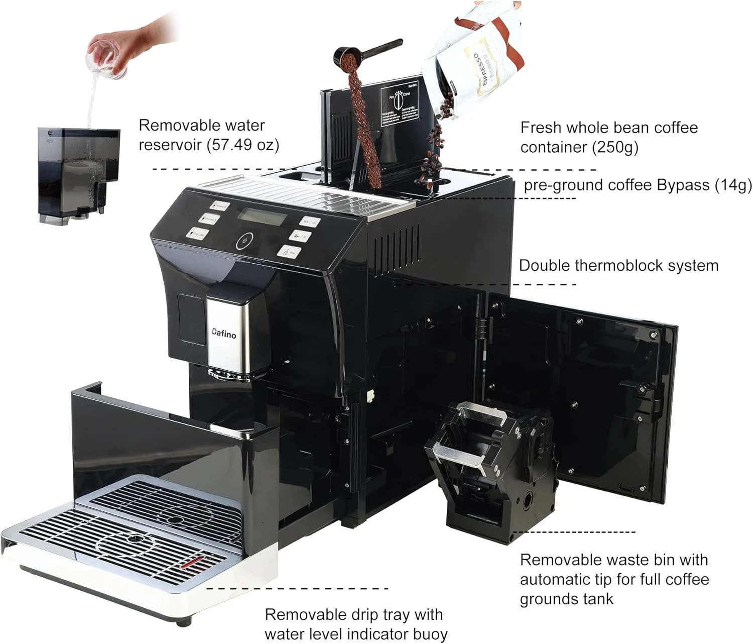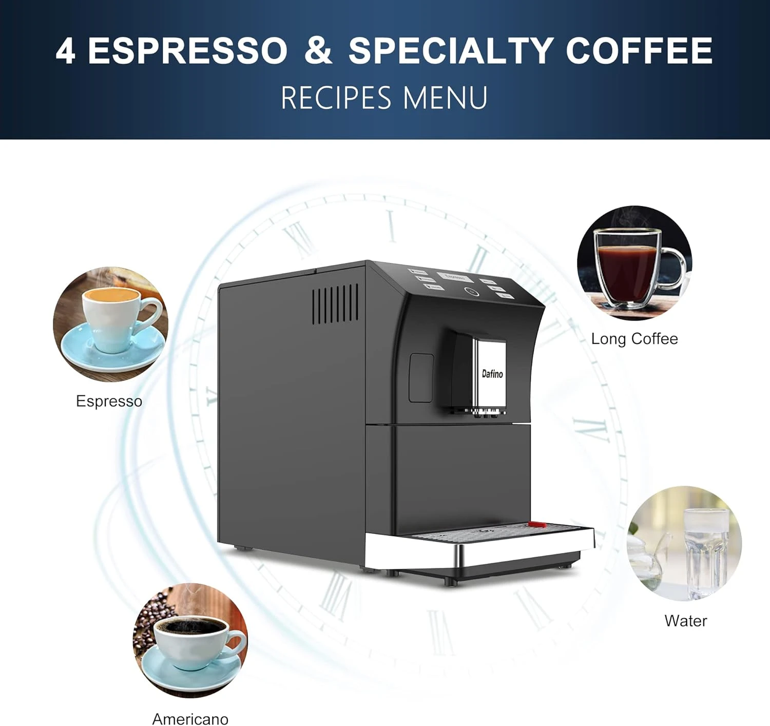 - AUTOMATIC CLEANING AND INTELLIGENT REMINDER: The espresso machine is self-cleaning when turning on or off, ensuring the taste of coffee and your health. The system alerts when the grounds container and drip tray are full or when shortage of water and coffee beans, so you can always know the condition of your coffee machine.