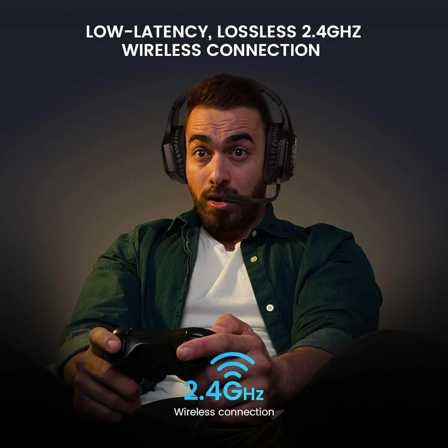 - 2.4GHz Ultra-Low Latency: Better than bluetooth, the E1000WT wireless gaming headset with USB dongle, acheive stable and lossless sound quality transmission with 2.4 GHz lossless wireless technology (<35 ms delay), which eusures an immersive lag-free wireless gaming experience and gives you a competitive edge in fast-paced games.
