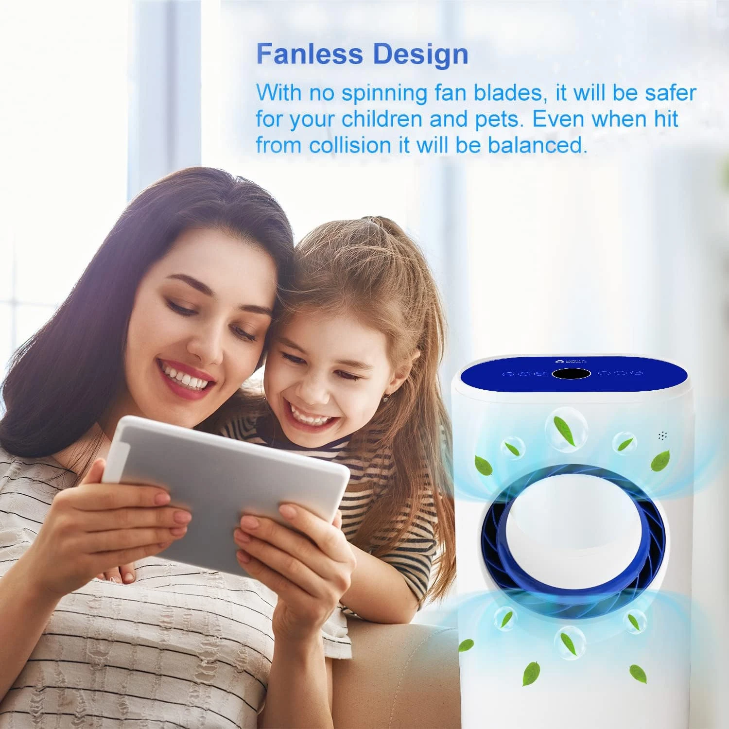 - 🧊 Bladeless Design: The motor and fan blades are built into the ring to help protect against accidental contact. Safe for families with small children and pets. Air coolers that have blades usually cut the air but the bladeless design delivers smooth and consistent airflow at a wider angle.