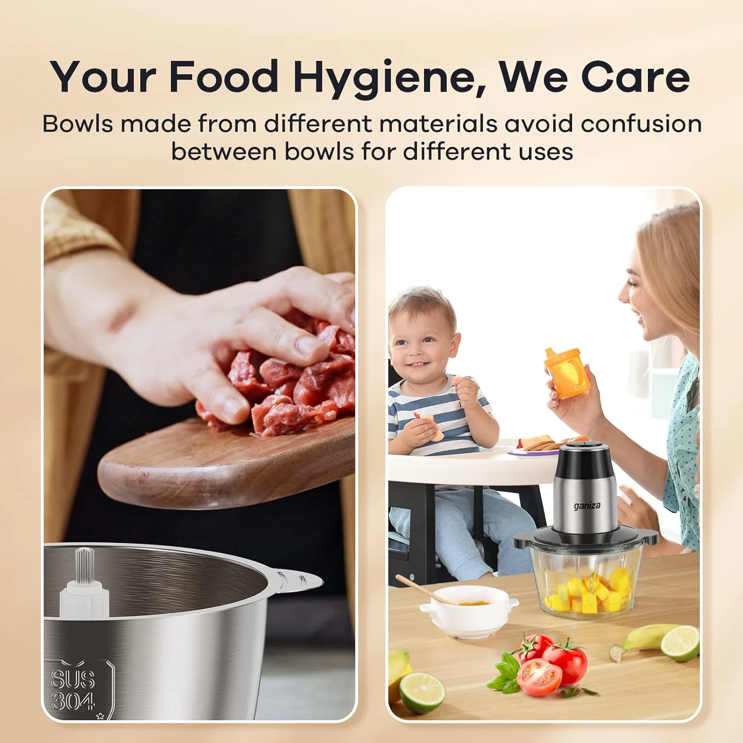 - 【Unlock Versatility with Two Bowls】Your food hygiene, we care. The Mixing Bowls are made from different materials (glass and sus 304 stainless steel) to avoid confusion between bowls for different uses, meat chopper and vegetable chopper, family processor and baby food processor.