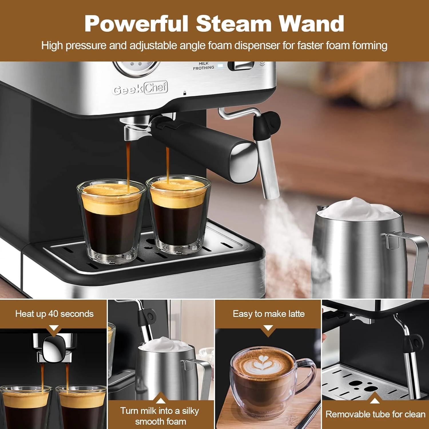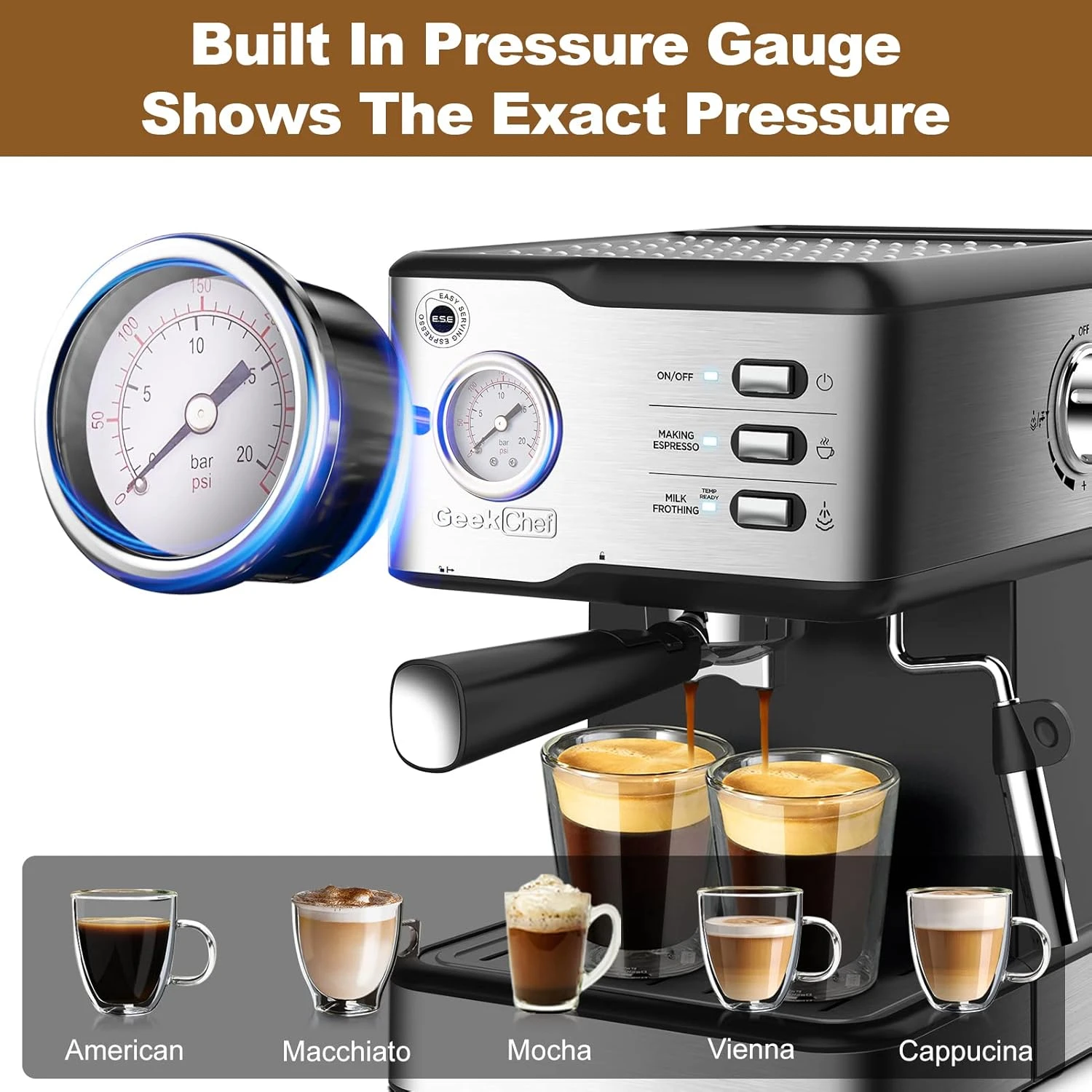 - ☕【BUILT IN PRESSURE GAUGE】 – With a pressure gauge, which shows you the precise pressure and helps you extract the perfect Espresso.visualized operation, suitable for beginner coffee lovers.