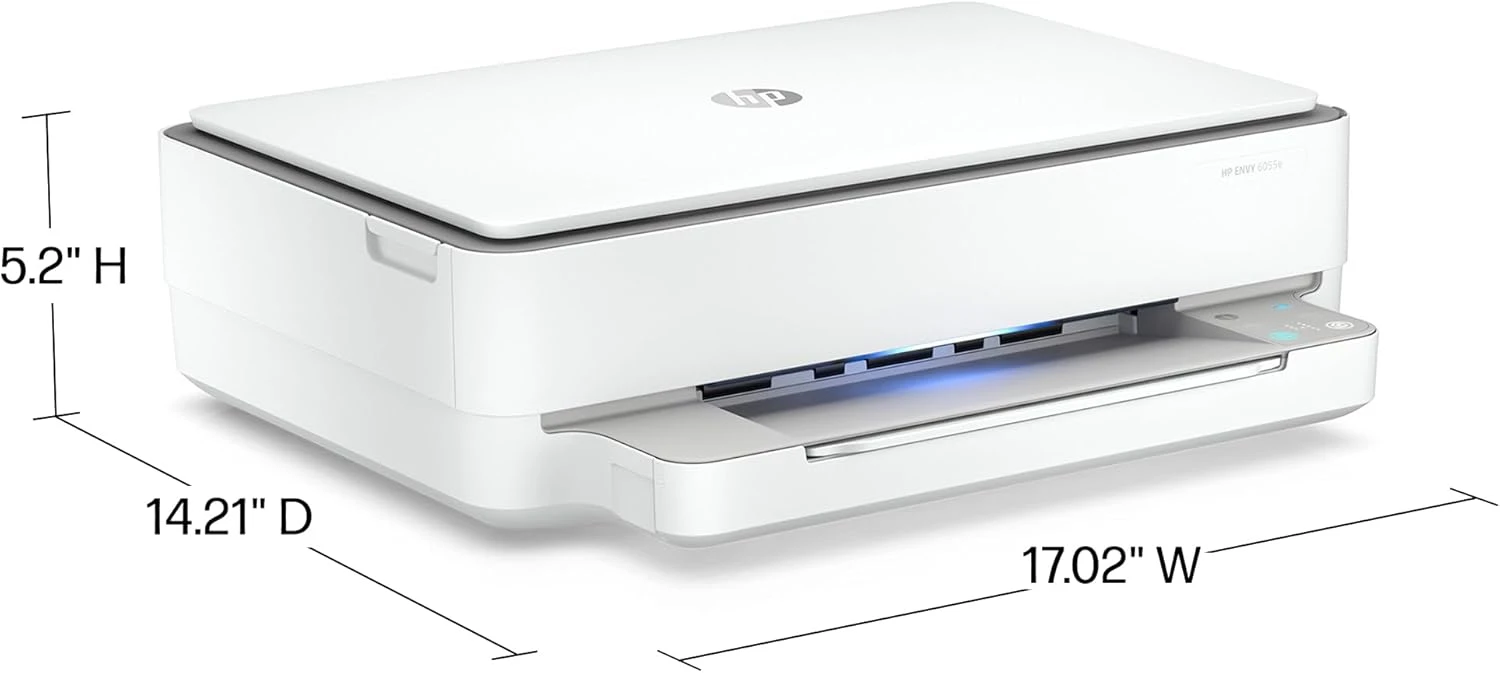 - PERFECT FOR HOME – The HP ENVY 6055e is great for busy families printing documents, borderless photos, homework and creative projects. Print speeds up to 7 pages per minute color, 10 pages per minute black..Operating temperature range : 41 to 104°F/5 to 40°C