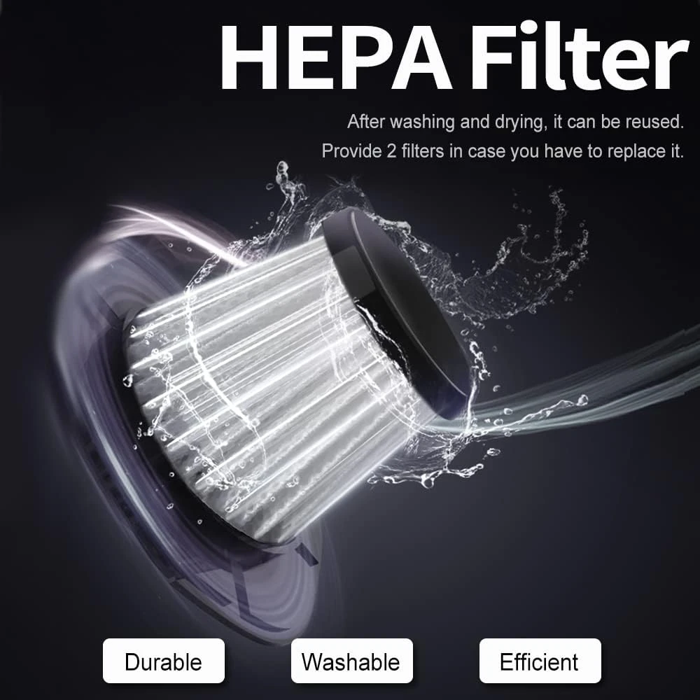 - 👍Versatile Attachments. A portable bag for storage. The hand vacuum cordless provides a corrugated extension hose, an extension tube, and a brush nozzle. Ensure that you can clean all areas, even the corners, and gaps. It comes equipped with in total 2 HEPA filters for your replacement. But the filter is reusable without worrying about changing the filter frequently. (You can wipe the dust with a brush or wash the filter directly.)