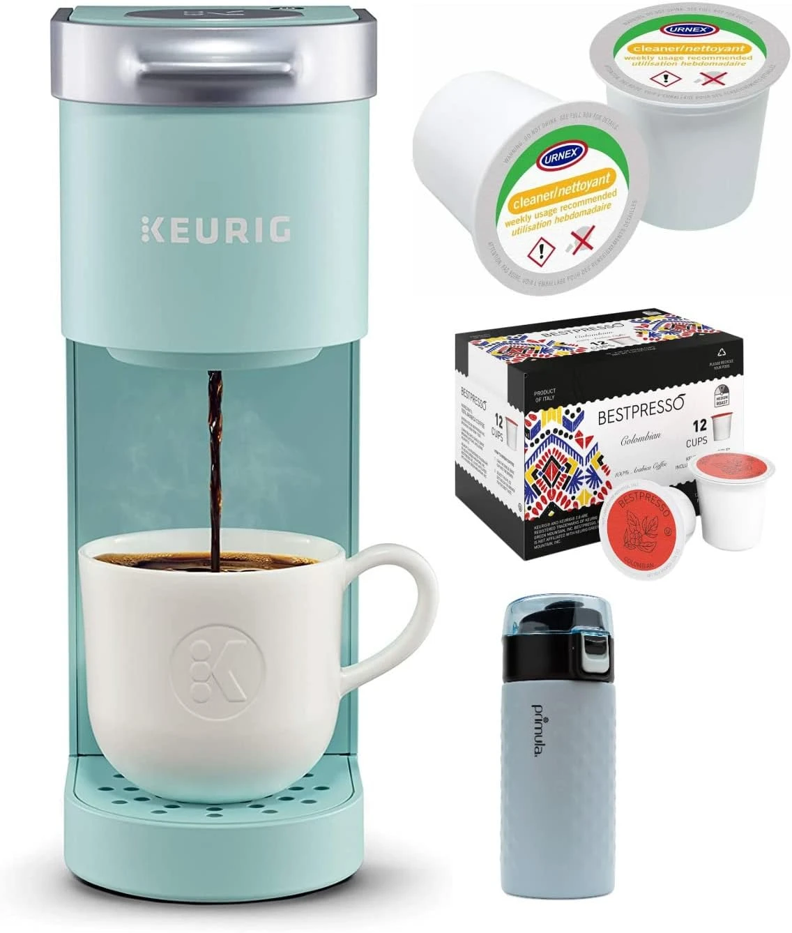 - Bundle Includes: Keurig K-Mini Single Serve Coffee Maker (Oasis) with 12-Ounce Double Wall Stainless Steel Tumbler, 12-Count Colombian Roast Single Serve K-Cup and Cleaning Cups for Keurig 1.0 and 2.0 Machines (5 Cups)