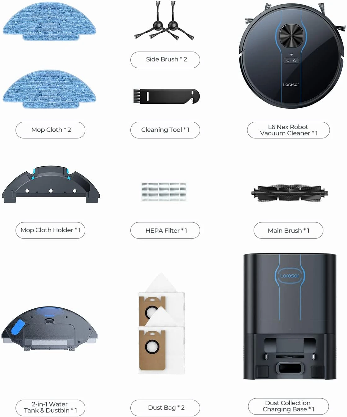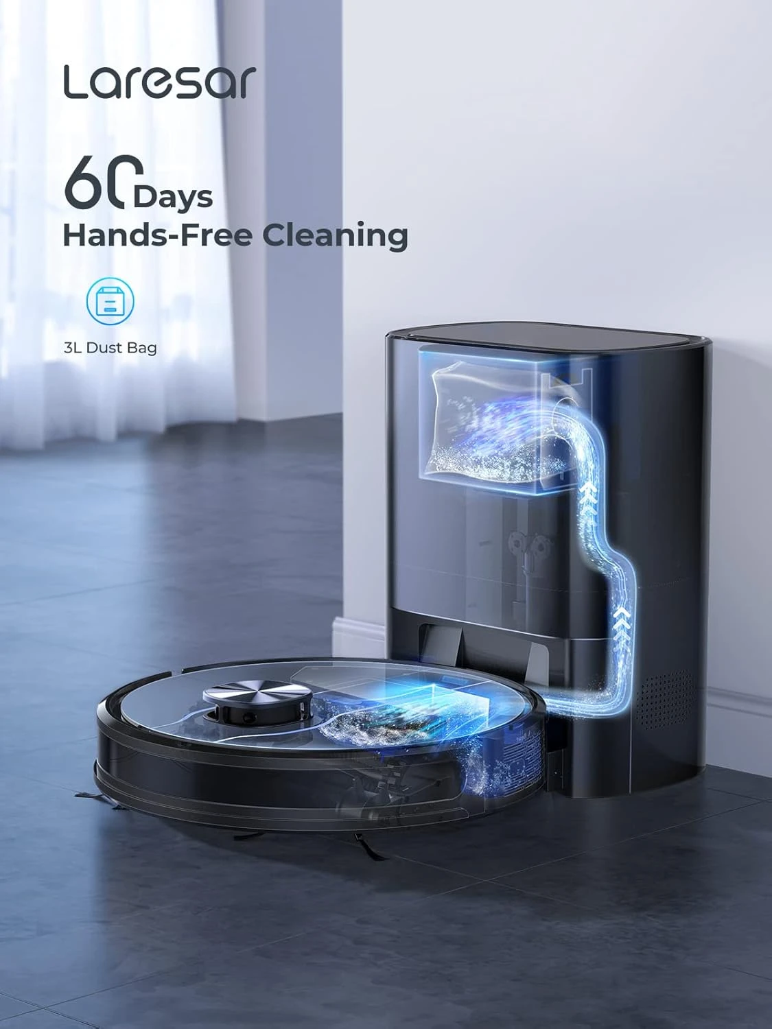 - ♻️【60-Day Hands-Free Cleaning】Laresar L6 Nex robot vacuum with mop adopts automatic dirt disposal technology to free you from frequently emptying the dustbin. And the dust bag has a capacity of 3L that can hold up to 60 days of dirt.