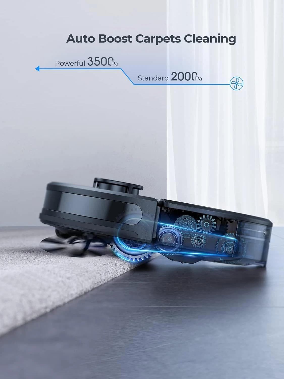 - 🌀【3500Pa Ultra Cleaning Efficiency】 L6 Nex comes with enhanced suction power up to 3500Pa that greatly improves cleaning efficiency and keeps all the dust at bay. Laresar robotic vacuum will auto-detect and adjust the power for deeper cleaning quietly no matter whether on wooden, ceramic floors, or carpets, and the long bristle brush won’t miss any corner in your house.