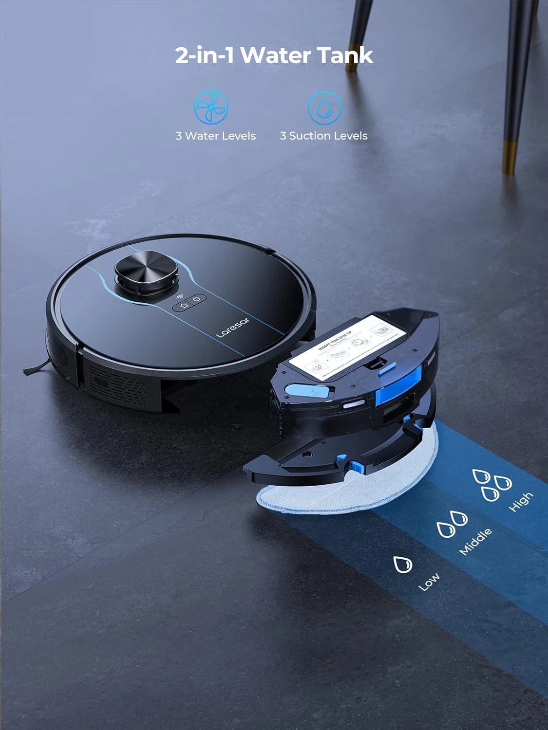 - ✨【All In One – Sweep, Vacuum and Mop】Laresar L6 Nex robot can vacuum and mop at the same time. Equipped with a 300ml dust box and 250ml water tank, 3 levels of suction power and 3 levels of water output can be controlled by the app to suit different conditions.