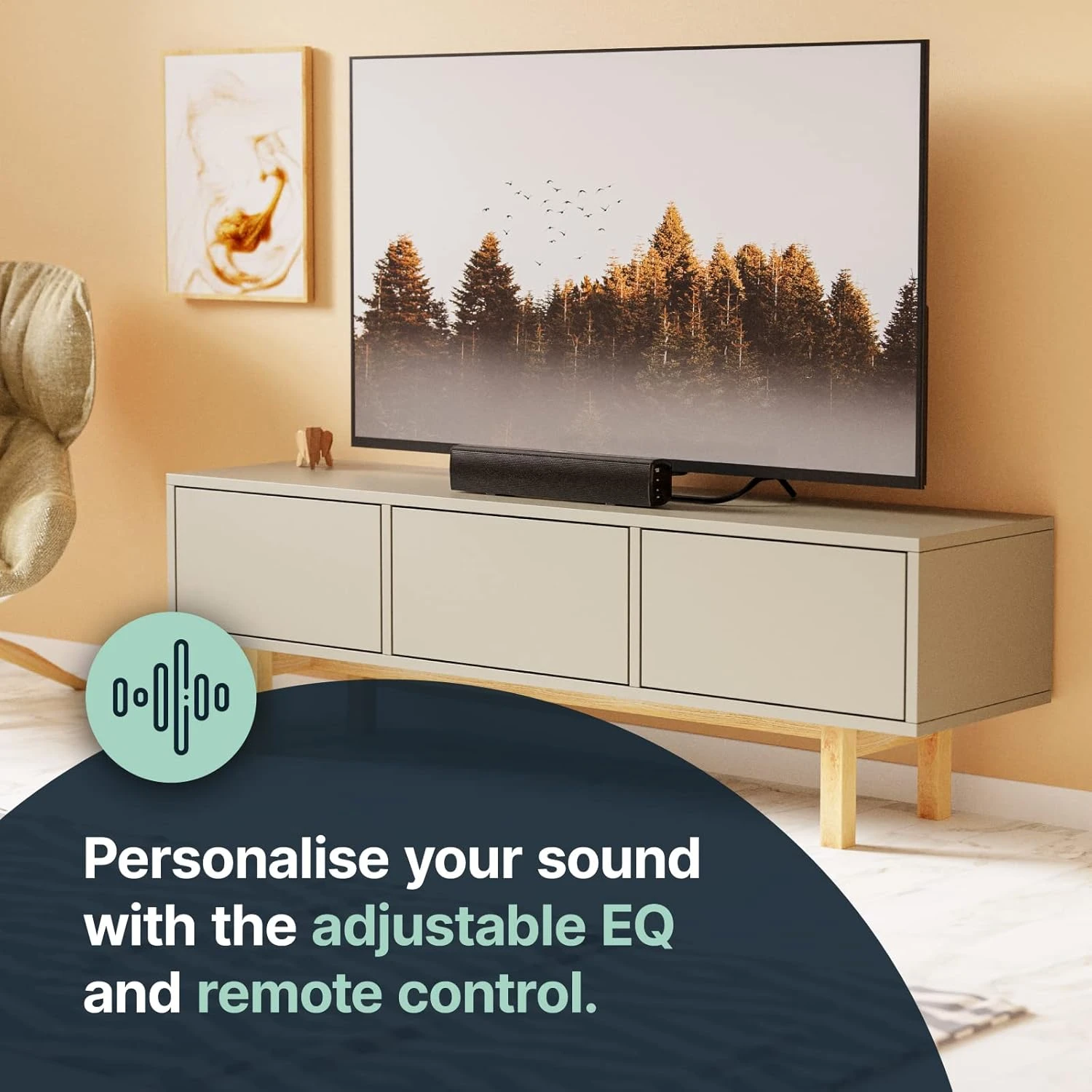 - COMPACT BUT MIGHTY: The Bowfell is a compact, slim audio sound bar device that fits perfectly on desks and sits comfortably under your TV. Use the buttons on the side of the soundbar or the supplied remote to go truly wireless and adjust the volume, equaliser settings, source and much more. An ideal sound bar for TV or PC, fill your room and immerse yourself with cinematic sound in your very own home.