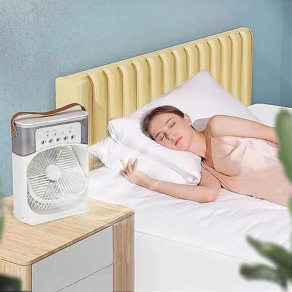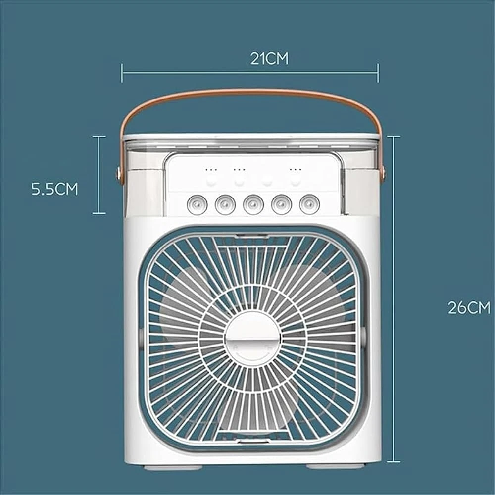 - 【5 in 1 Mini Frost Fan】This personal air cooler combines a portable air conditioner and an humidifier. 5 in 1 functional design, low-noise powerful fan, 5 large-caliber atomizers, 7 color lights, timer (1H / 2H / 3H) to meet all your needs.