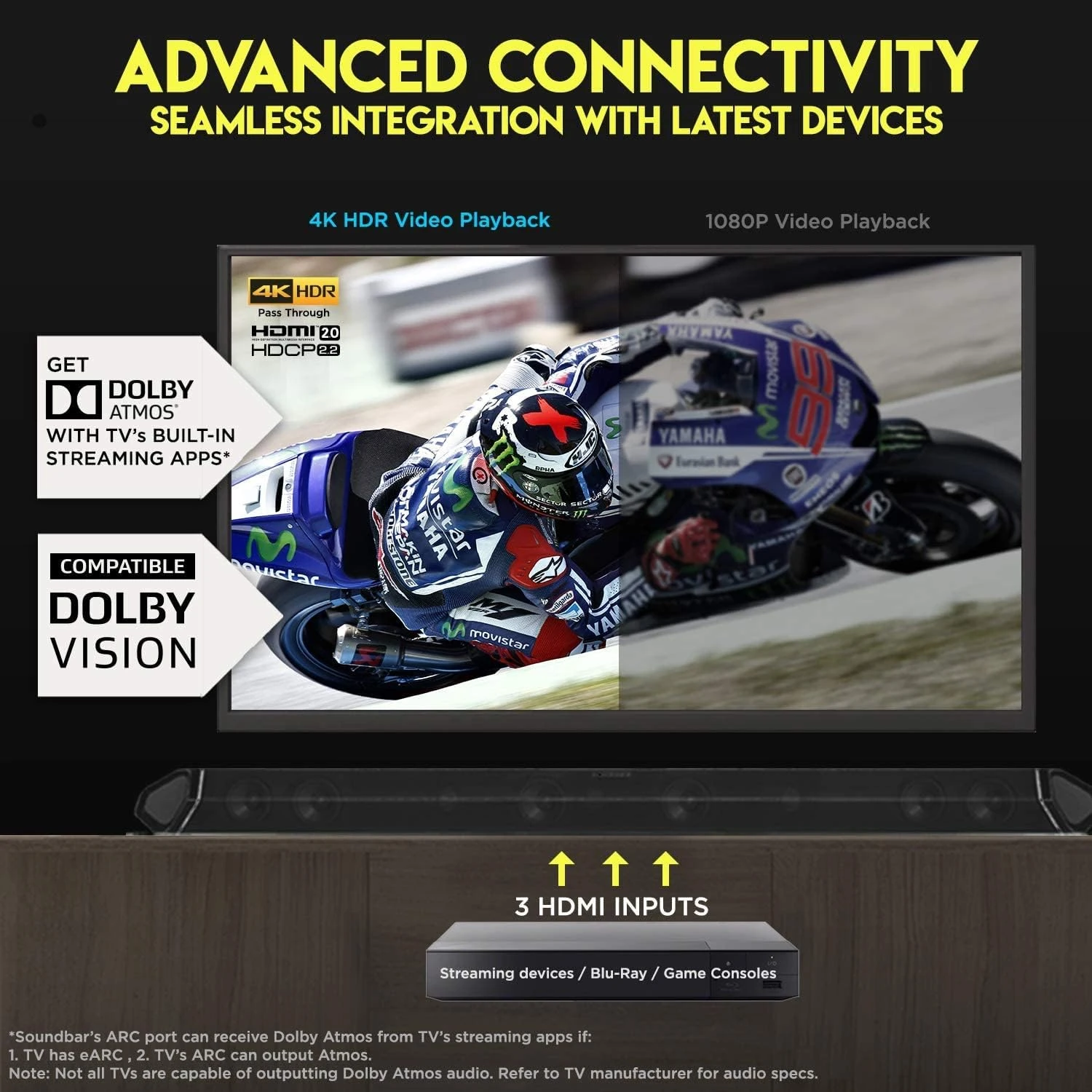 - Enjoy advanced connectivity with Dolby Vision, 4K UHD pass-thru and High Dynamic Range (HDR). Connect up to 6 devices via 1 HDMI ARC, 3 HDMI, 1 Optical and 1 Coaxial inputs. The 52-key backlit remote allows seamless control of sources, DSP modes, individual channel and room size optimization