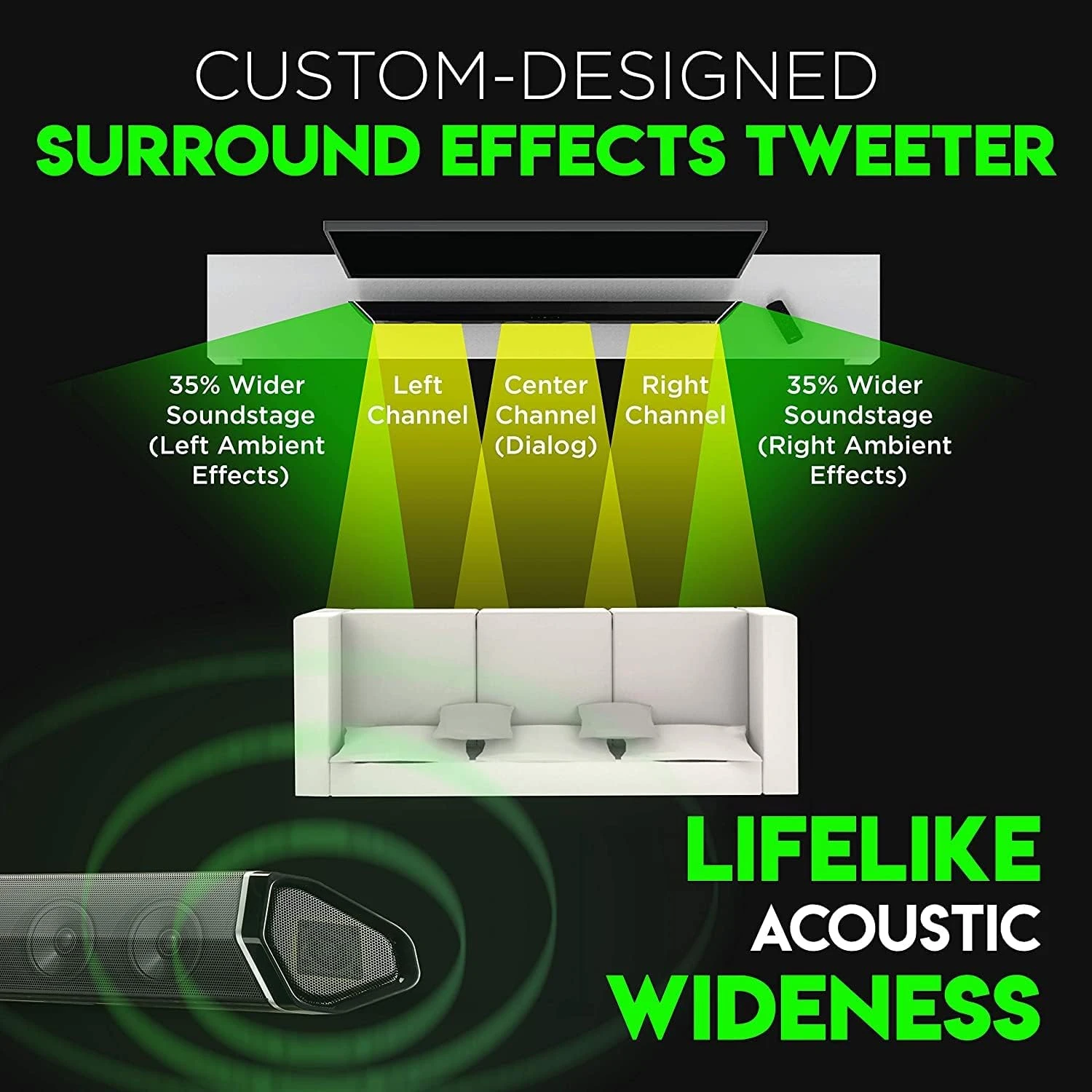 - TWO 2-WAY REAR SPEAKERS (industry’s 1st!) produce spacious and dynamic surround sound. Each of them (connected to sub via RCA wires) is constructed with a tweeter that reproduces high frequencies with captivating clarity, and a full-range driver that delivers surround effects with power and precision. Simply put, the surround sound performance from simulated/virtual 2.1 or other 5.1 channel surround soundbars does not come anywhere close to this.