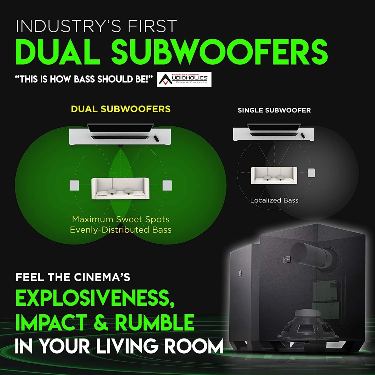 - Our DUAL 8″ WIRELESS SUBWOOFERS (industry’s 1st!), the new soundbar reference standard for bass, produce ground-shaking rumbles that turn your living room into an epicenter of adrenaline-pumping action. They merge to distribute the sonic boom evenly throughout the room with zero localization. Unleash cinema-level volumes without a trace of distortion, replicating the perfect theater experience. Agreed among experts, TWO subwoofers are a must for ultimate home theaters.