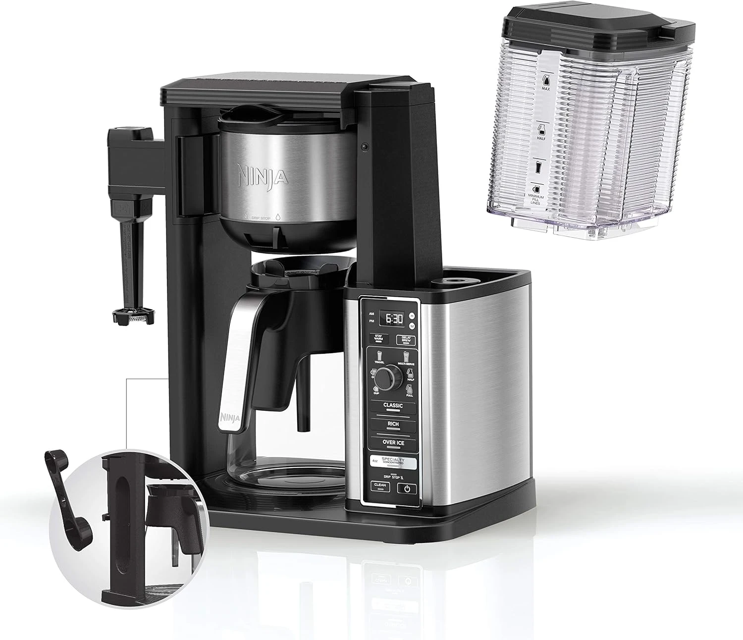 - AUTOMATIC SHUTOFF: After one hour of inactivity, the system will power off automatically..WHAT’S INCLUDED: Ninja Specialty Coffee Maker, 50-oz (10-cup) Glass Carafe, Fold-Away Frother, Permanent filter, 40-oz. Removable water reservoir, Ninja Smart Scoop, Recipe Inspiration Guide, quick start guide & owner’s guide. Cord length (ft.): 2.5