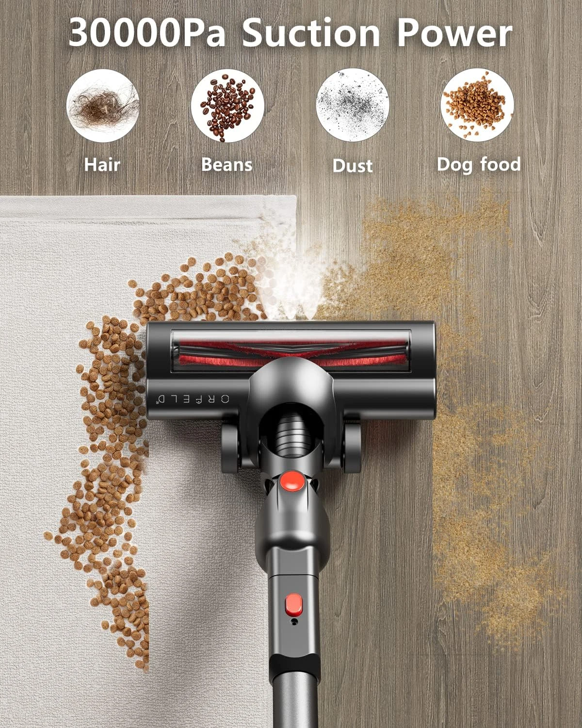 - ➤【30KPa Powerful Suction】ORFELD cordless vacuum cleaner maximum mode can reach 30KPa powerful suction power, can instantly suck away dirt, debris, pet hair and stains, easy to clean hard floors, tile, carpets and hardwood floors. 63db extra low noise making it suitable for everyday use around children and pets.