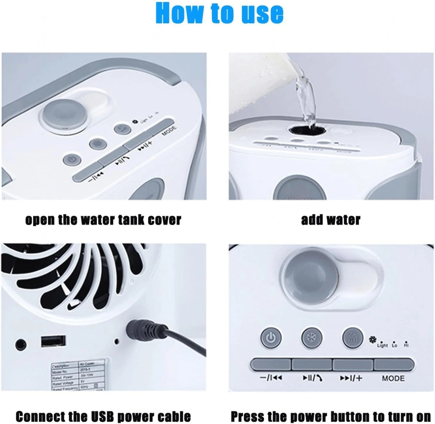 - Multifunctional Personal Air Cooler: It is not only a personal air cooler, but also has a Bluetooth speaker function, and can also be used as a mist humidifier, desktop cooling fan, and air circulator. It uses ultrasonic atomization technology to atomize water, which can humidify the air and moisturize the skin. Let you stay away from the dry air and enjoy the moist and cool fresh air in summer. (Note: This item is for personal use only and will not cool a room.)