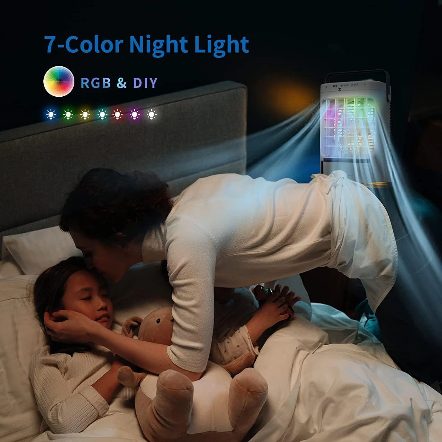 - Quiet operation & 7 colors LED Light:Enjoy peaceful and comfortable sleep at a cool temperatures. Comes with 7 changing colors LED light creating a romantic atmosphere. Unlike other small air conditioners, the air conditioner have upgraded the lighting function. You can turn off the light at any time
