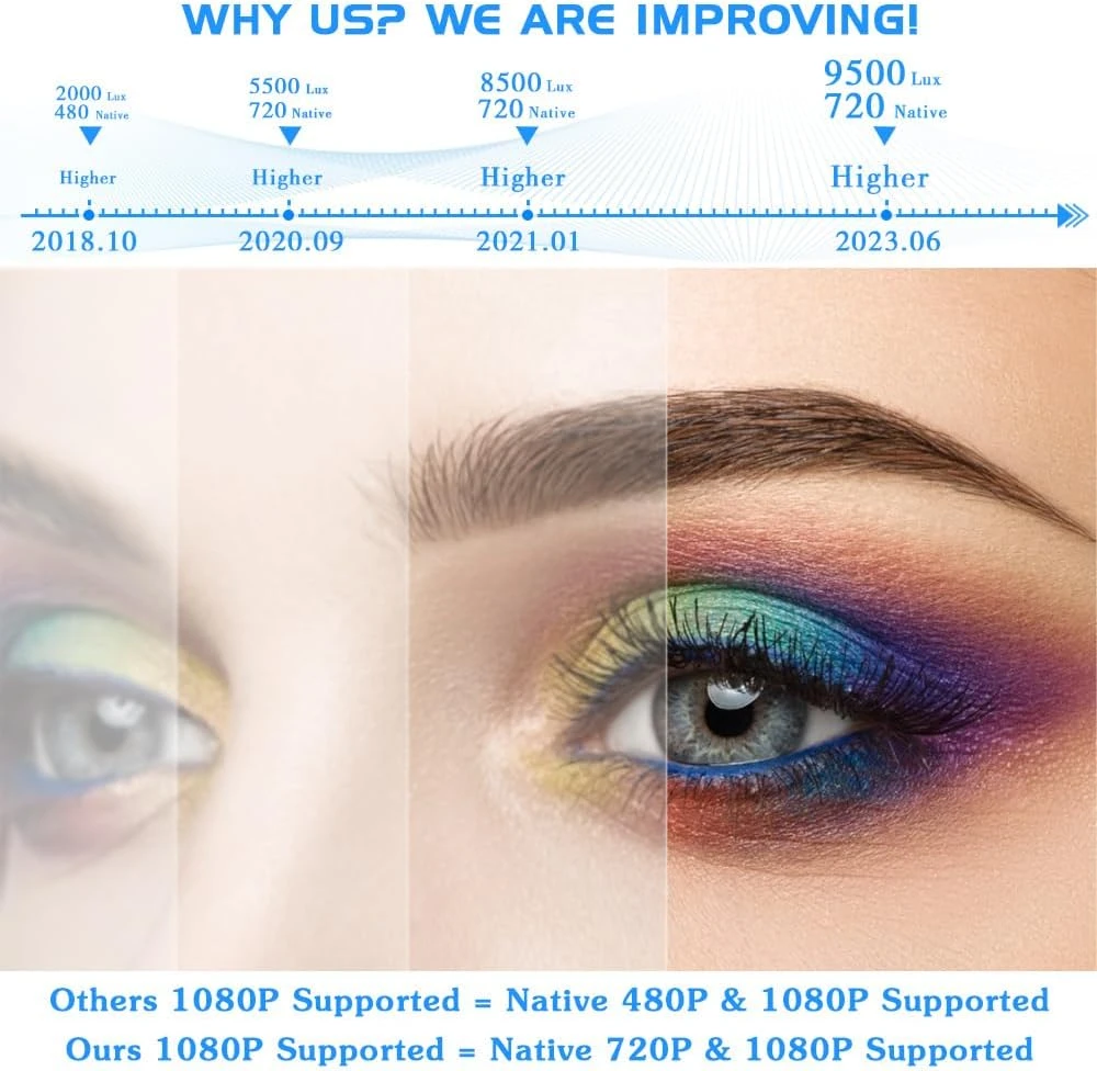 - [THREE Added Bonus Better than others] (1) UPDATED BRIGHTNESS: Our 9500L is more real than others. It is much brighter than 99% mini projectors. (2) UPDATED NATIVE RESOLUTION: our wifi mini projector’s native resolution is 1280 x 720P, with 1920x1080P supported, better than 90% mini projectors which are native 480P. (3) ADD BLUETOOTH: It is a mini projector with wifi and bluetooth, you can hook up external speakers via bluetooth, the sound is greatly enhanced and sounded theater quality.
