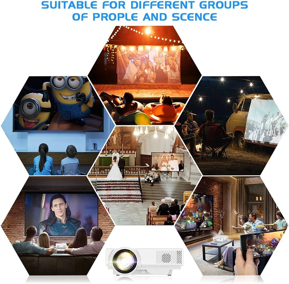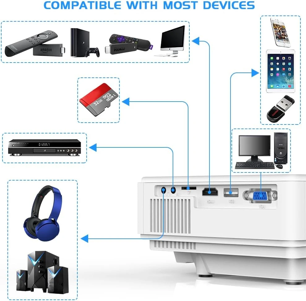 - [Wide Compatibility and Application] Equipped with HDMI, VGA, AV, USB interfaces, the projector is compatible with TV Box, TV Stick, PCs, Laptops, Tablets, USB Flash Drive, players. It’s supposed to apply many environment—Home Theater, Video Game, Party, Outdoor activities. You can use it for small meeting in dark room, but it is not a professional office projector for PPT or text. As the copyright, some videos (such as Netflix) can’t be played via phone connection (wifi or usb).