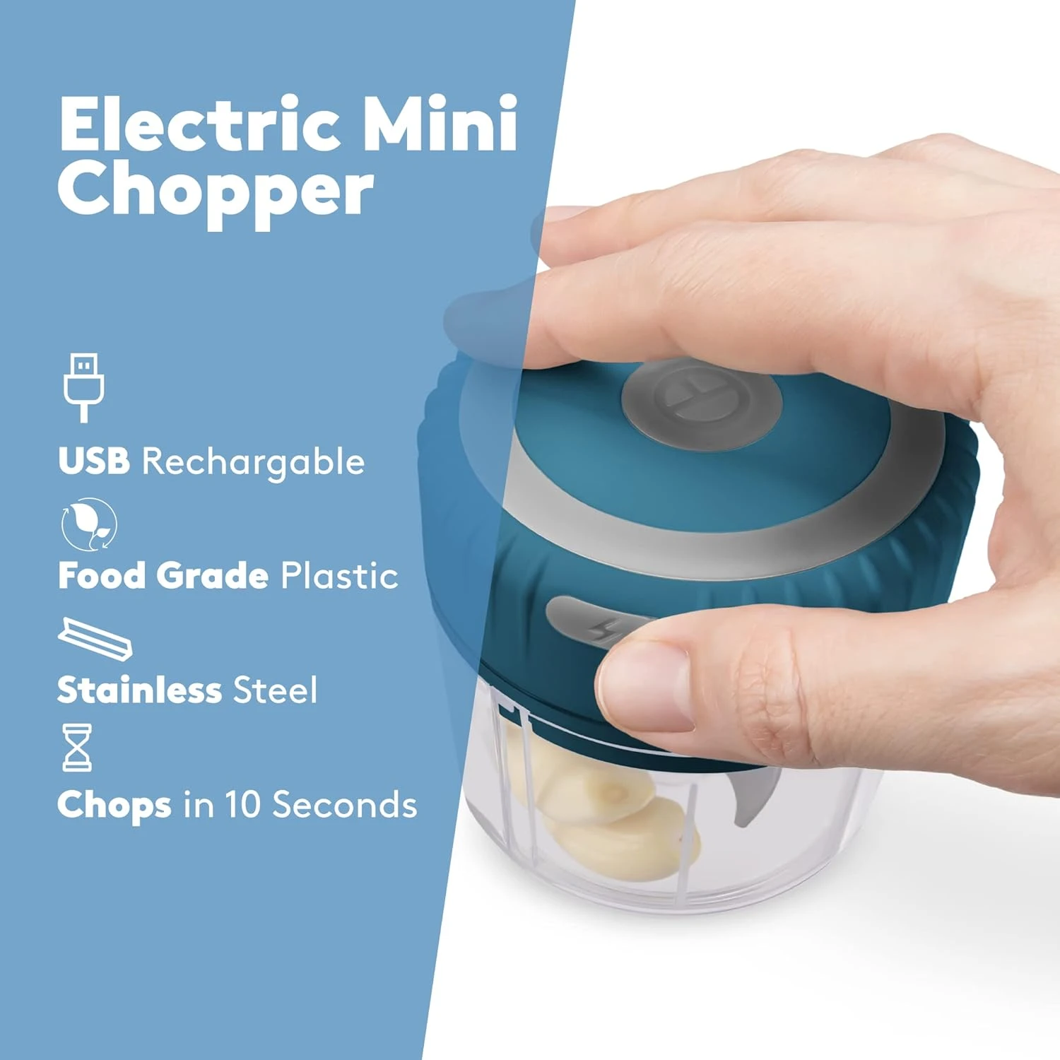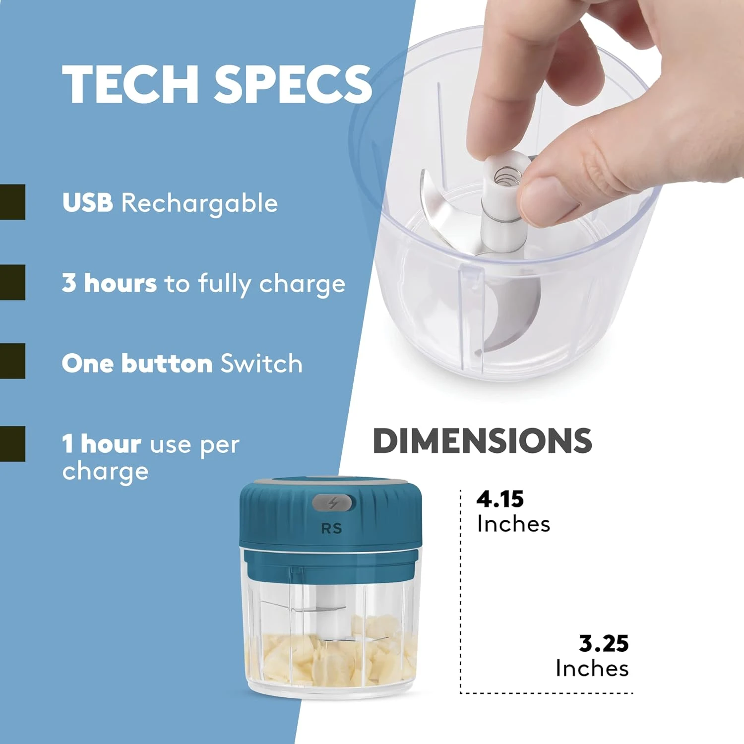- OPTIMAL SMALL FOOD CHOPPER CONSTRUCTION: The rechargeable advanced mini chopper was made with not just portability in mind but veggie chopper functionality. It comes with a 430-grade triple steel blade design, a colorful anti-stain gasket and only needs one touch for this small food processor