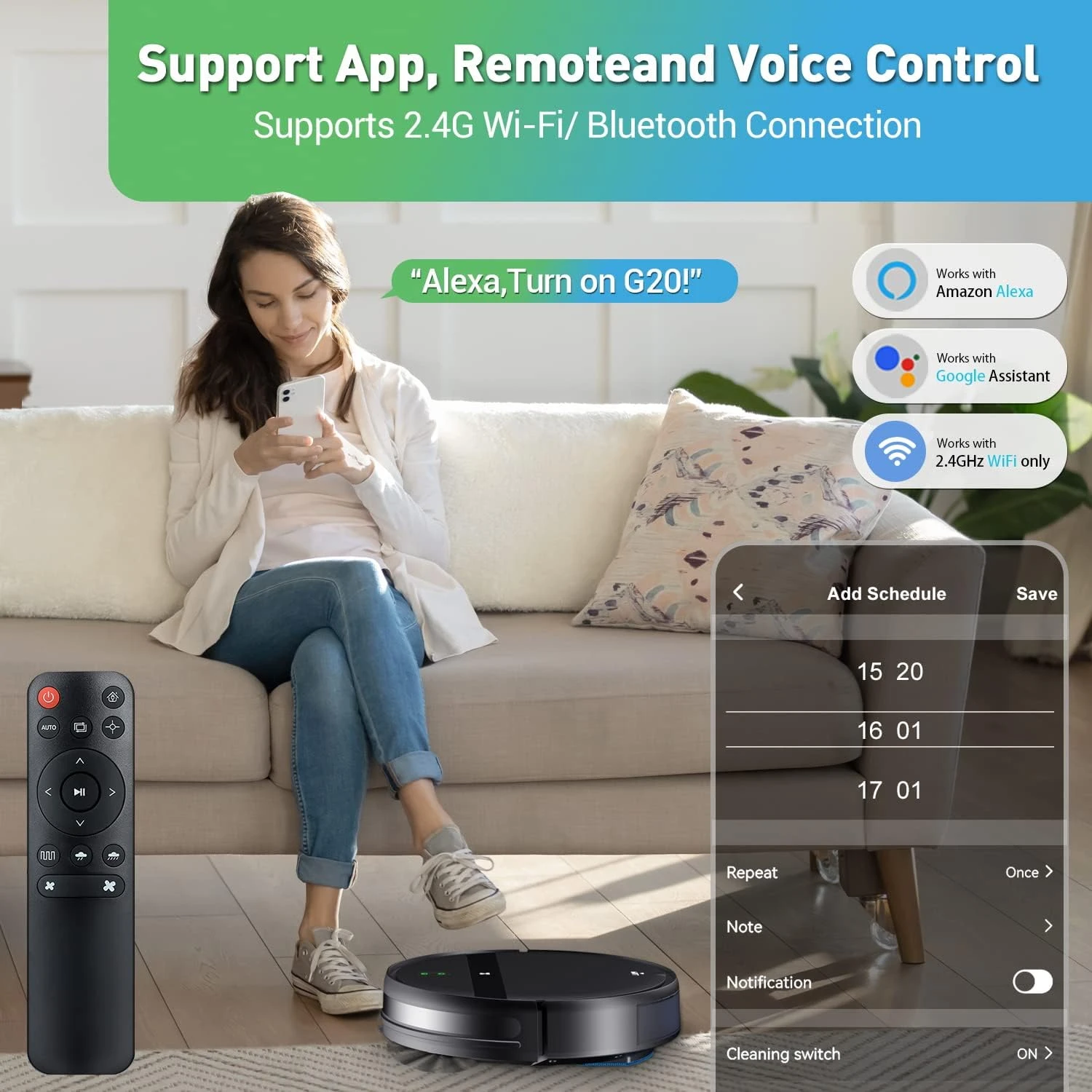 - 🏠[DESIGNED FOR YOUR DAILY HOUSEHOLD CLEANING] G20 robot brushless motor and 2600mAh super high capacity battery with up to 100 minutes running time and a slim body of only 2.91 inches can clean all areas of your home in all directions. When cleaning is over or the battery is low, it will automatically return to the charging base for charging.