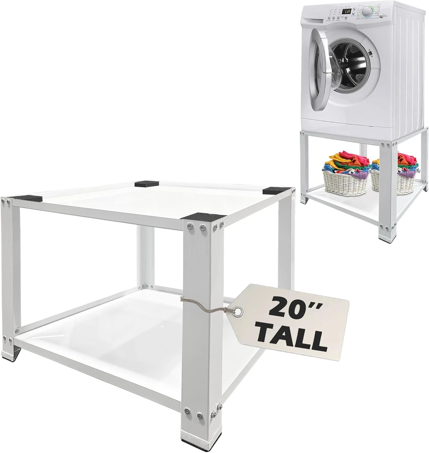 - 【Perfect Dimension】This price includes one laundry pedstal. The base measures 28” in width and length, and 20” in height (Elevates your appliances by 20 inches ). It helps lift appliance to a more suitable working height,to reduce your back and knee strain and increase accessibility. And the under shelf offers extra large storage space for your convenience. Comes with 4 cushion pads for decreasing the noise