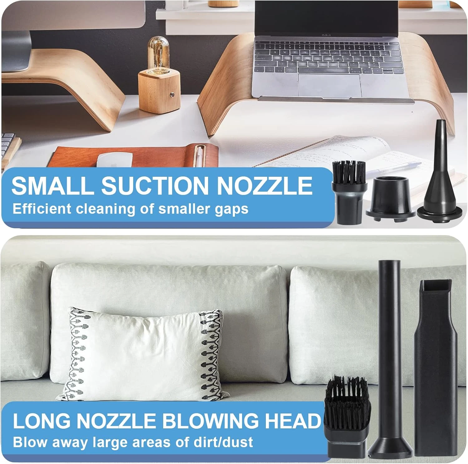 - 5 Innovative Brush Heads: Mini auto vacuum cleaner has 5 brush heads (including the original head), which can easily clean up the dust in some small corners such as the gap/keyboard/inside the car, leaving no dead space.