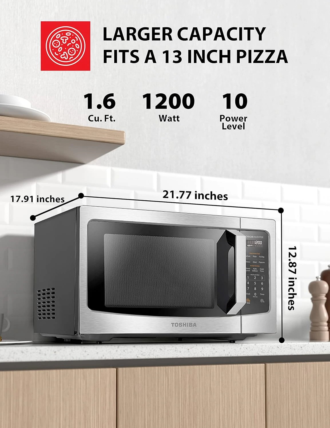 - 【Sleek Design with Large Capacity】Stylish Stainless Steel (color of door frame is stainless steel, enclosure is black) with timeless design, 13.6″ removable turntable fits a 12″ pizza. external dimension (wxdxh): 21.8×20.2×12.87 inches, internal dimension (wxdxh): 15.5 x 17 x 10.2 inches; needs 1.2 inch back to the wall