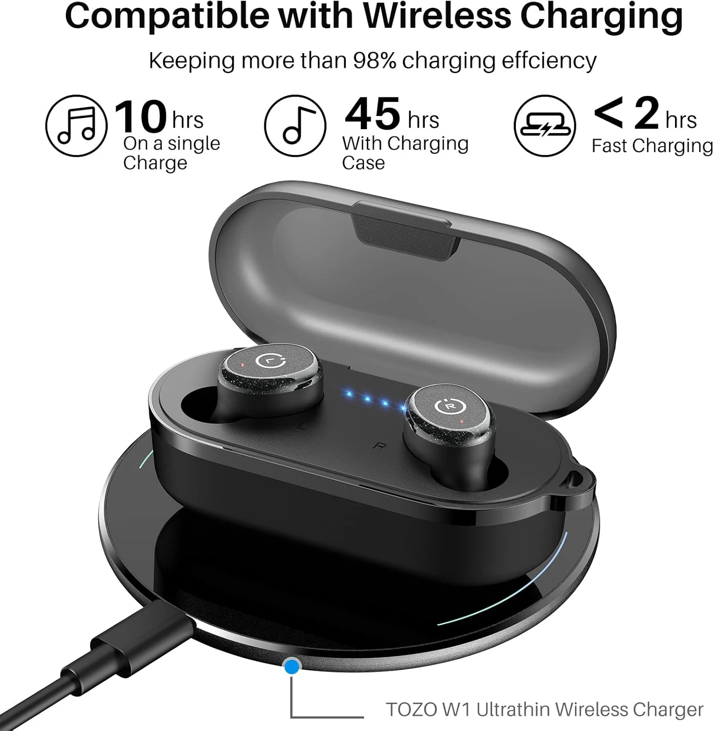 - [Charge on the Go] The TOZO T10 Earbuds offer a playtime of over 10 hours on a single charge, with a total playtime of 45 hours with the charging case. The rechargeable case can be fully charged in just 1.5 hours with a fast-charging USB-C cable or less than 2 hours via a wireless charger.
