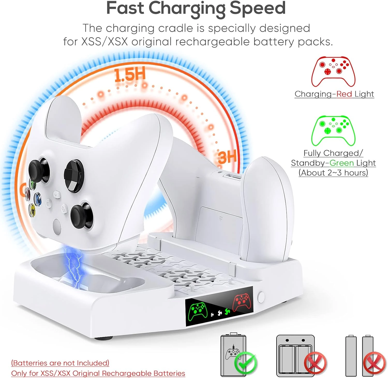 - 【Upgrade multi-functional stand】Upgraded multi-functional stand is specially designed for Xbox Series S console and original controller for Xbox Series S/ X. The cooling stand build with 3 levels wind power cooling fans, dual controller charging ports, 1 headphone stand and 2 USB ports (Please use 5V/2A power supply to provide sufficient current, the cooling stand NOT work for Xbox Series X console). NOT include battery packs.