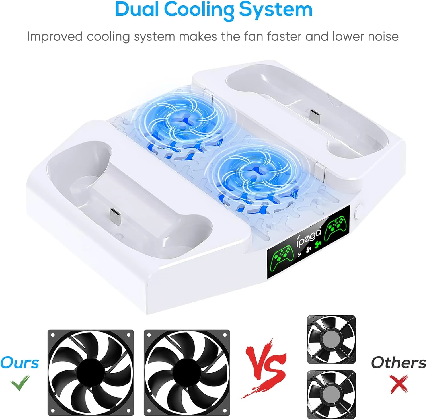 - 【Detailed design】 Smart indicator light lets you see the charging status at a glance (The light show red when charging, turn green when full). The 4 bumps and foam pads on the surface of the fan board will dovetail perfectly with the holes of your console. It will allow your console to be securely fastened to the vertical holder without tipping over (this problem often happens in homes with pet cats that love to climb and jump)