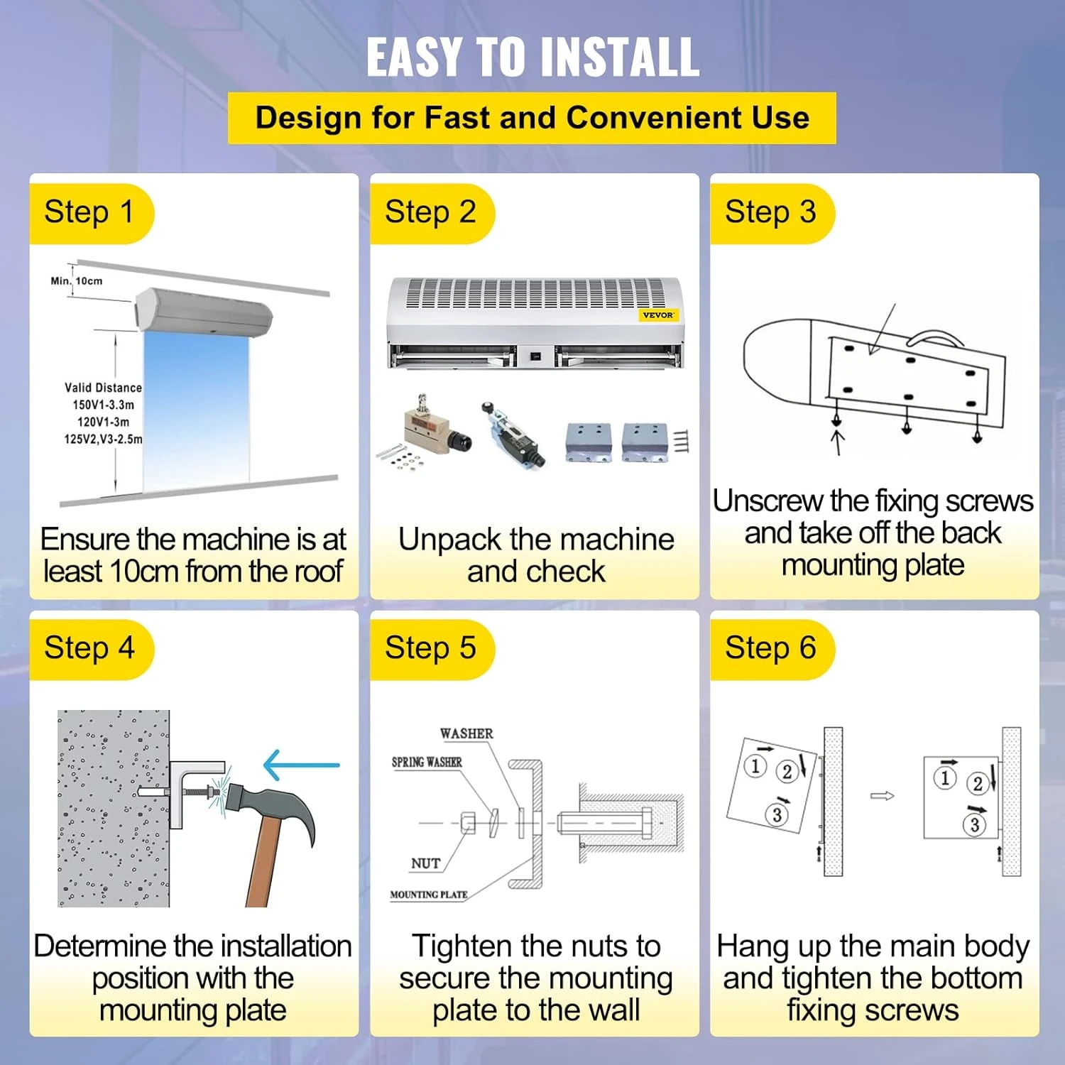 - Easy Installation: This air curtain is suitable for 137.8″ (3.5 m) high doors. Referring to the user manual, attach the mounting plate securely, hang the air curtain, install the optional door switch, and connect to the dedicated two wires.