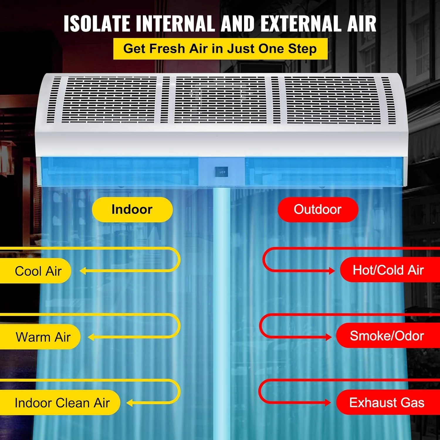 - Isolate Interior from Exterior: The air curtain creates a high-speed airflow at the entrance to isolate the inside and outside air environment and avoid 90% of hot or cold air, smoke, and exhaust gas. NOTE: Air curtain is not a wall mount air conditioner. It can not bring cold or hot air.