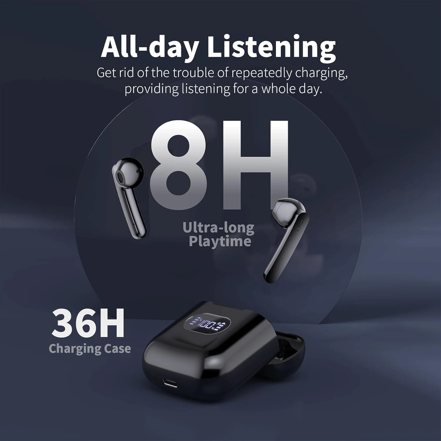 - 【36H Playtime & Two Charging Methods】Earbuds get 8 hours of listening on a single charge and up to 36 hours when you use the charging case to recharge. Saying goodbye to the troubles of frequent charging. The charging case can be charged via Type C or a wireless charging pad. The rechargeable case can be fully charged in just 1.5 hours using a cable or less than 2 hours with a wireless charger.